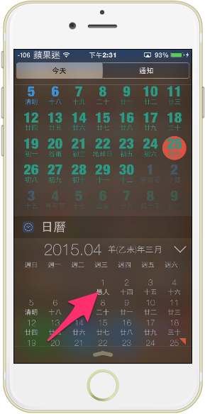 我們再來看到農曆行事曆的部分,除了看到帶有農曆的大月曆之外(如果不喜歡這個顏色,可以在之前提到的 App 內那些開關中做更換顏色),我們針對單一日期點擊一下!