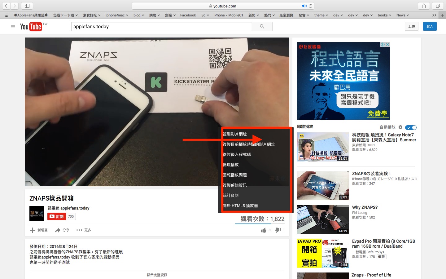 這一篇文章將逐步帶各位操作 macOS Sierra 的新功能~Youtube PIP (畫中畫功能),首先請打開你的 Mac Safari 瀏覽器並且連接上 Youtube 網頁,點擊網頁的任合一段影片之後,在影片上按右鍵,會出現如圖中的黑色背景選單,當中是不會發現 PIP 的選項的。