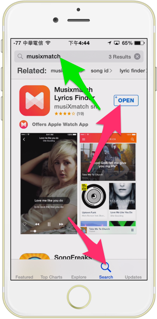 然後按下搜尋的按鈕(紅色箭頭),在搜尋欄(綠色按鈕)打上Musixmatch,就可以找到他,找到之後,就可以按下取得囉( 或是按我下載 ),這是一款免費的 App ,請安心下載!