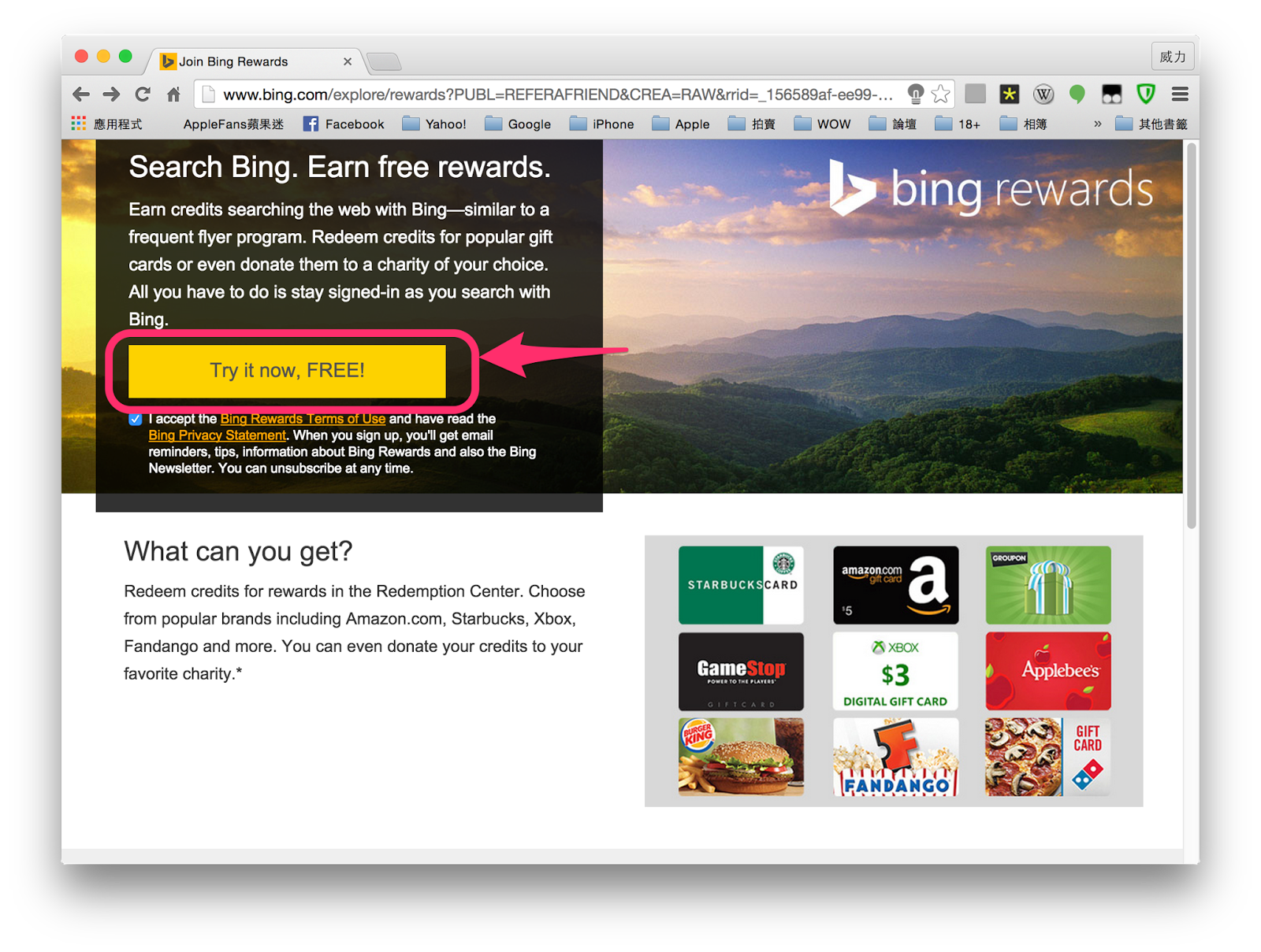 10. 進入 Bing Rewards 頁面,並點擊【Try it now, FREE!】:點此進入