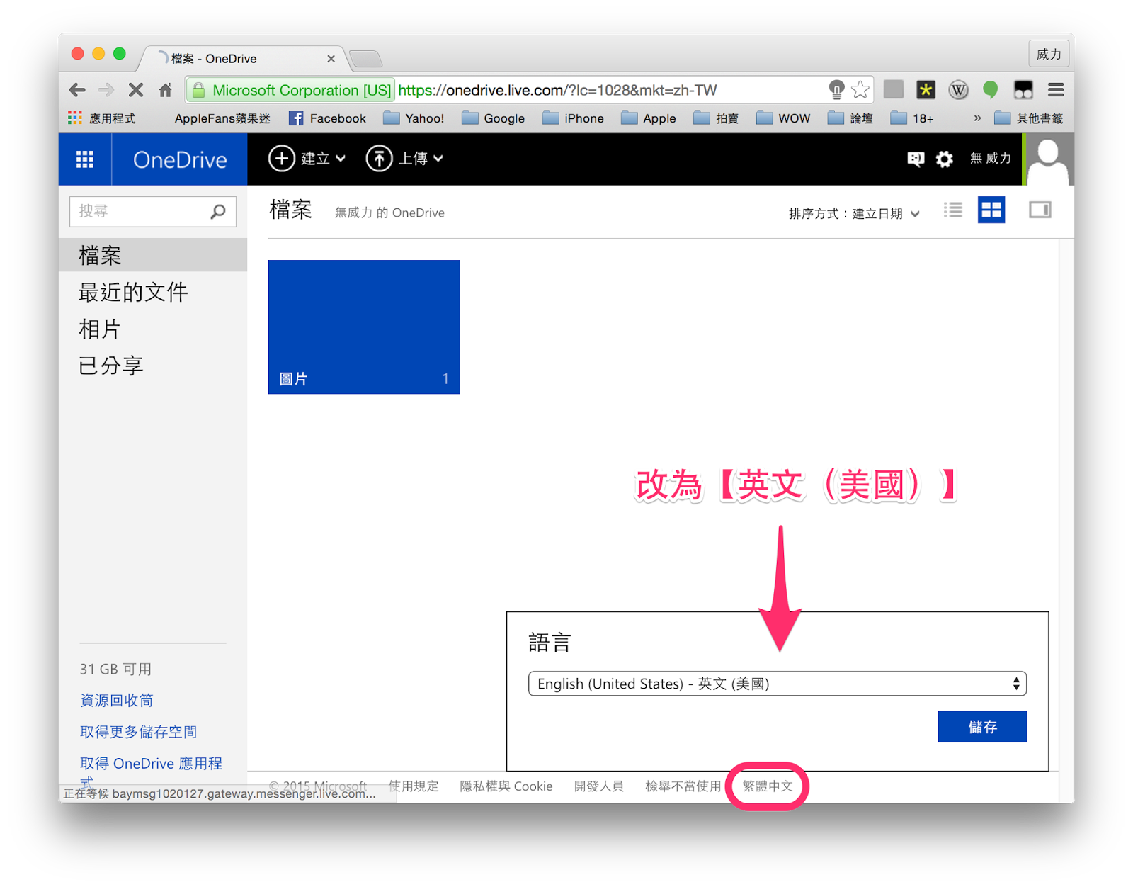 3. 將語言從「繁體中文」改為「英文(美國)」