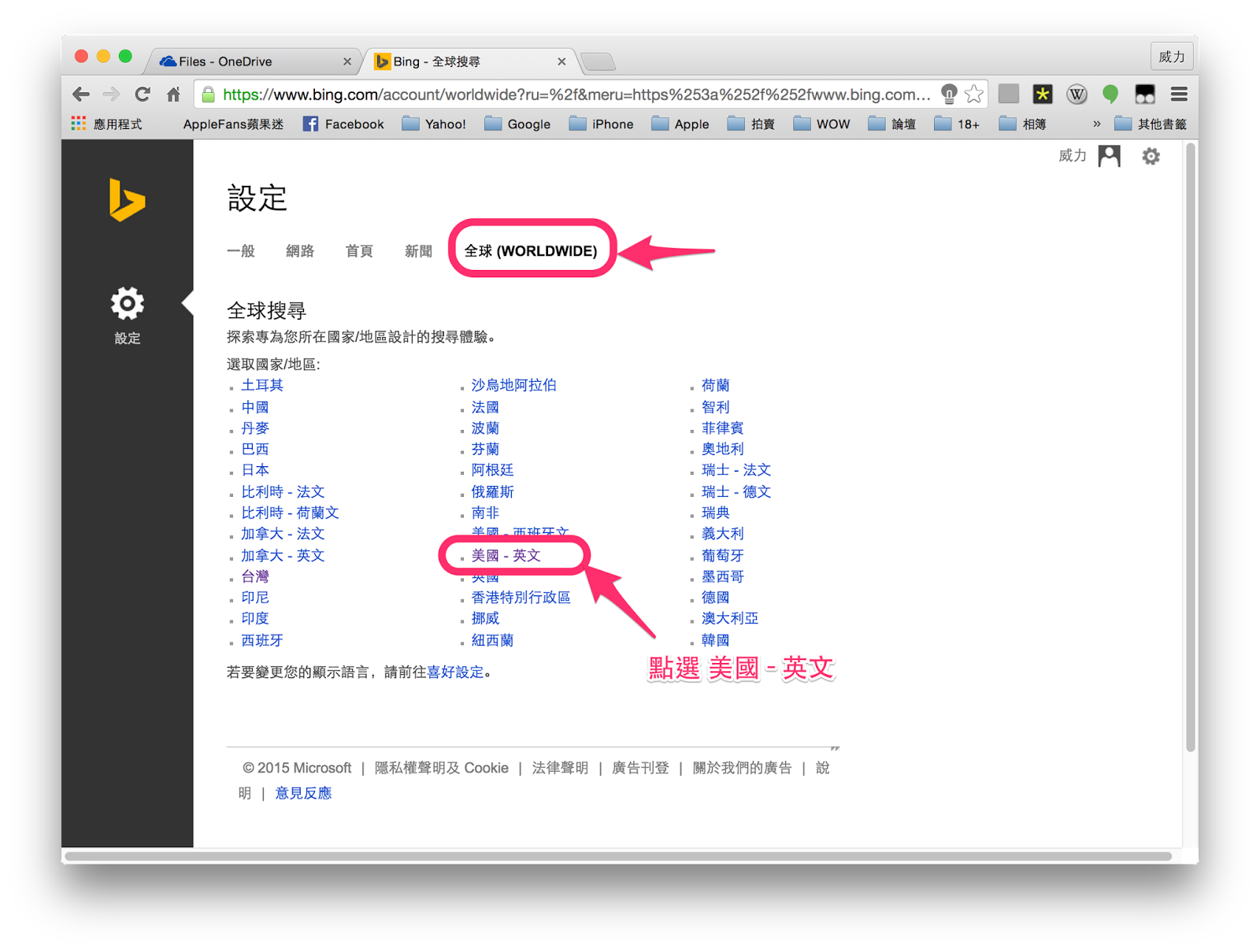 5. 在【全球(WorldWide)】頁面,將「全球搜尋」的地區改為【美國 – 英文】