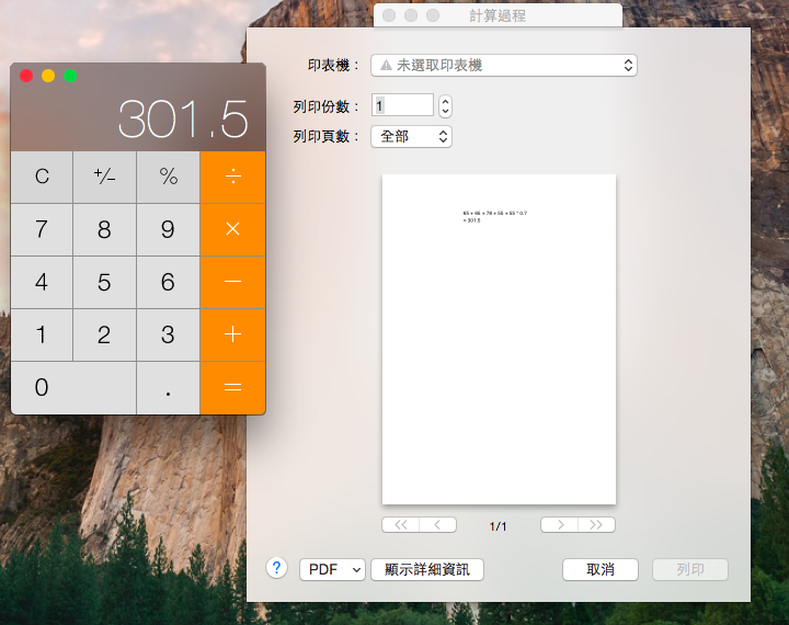 P.S. 順帶一提,按下 ⌘+P 也可以直接列印出計算過程,而且預設值是 PDF 格式,所以不必擔心相關的科學符號在另存檔案後可以會產生亂碼等等的問題哦!