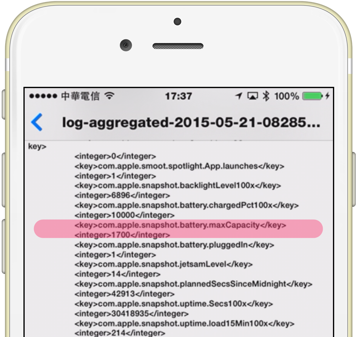 下面有一行 <integer>數字</integer>,裡面的數字,就代表這隻 iPhone 目前電池的最高容量