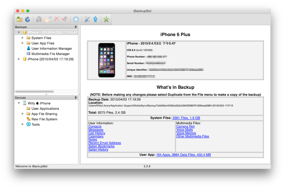 安裝完後,進入 iBackupBot 並將 iPhone/iPad 連上電腦,出現一些錯誤訊息也不影響,之後可以看到裝置的基本資訊(只是不曉得為什麼 iPhone 6 會判斷成 iPhone 6 Plus 就是了…=.=