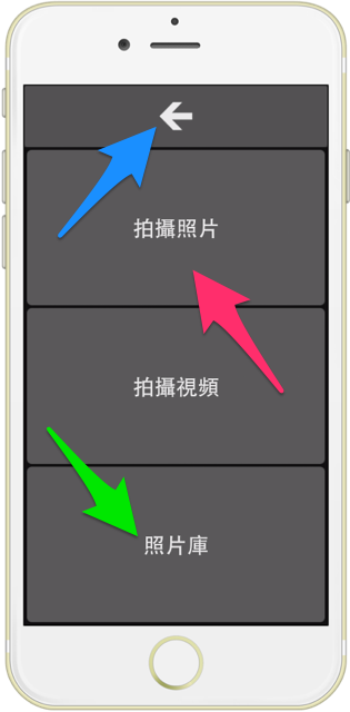 按下照相機的按鈕之後,就可以選擇要拍攝照片,還是拍攝影片,或是看照片 ,按下去之後就會呼叫切換到內建的相機、攝影機或是相本