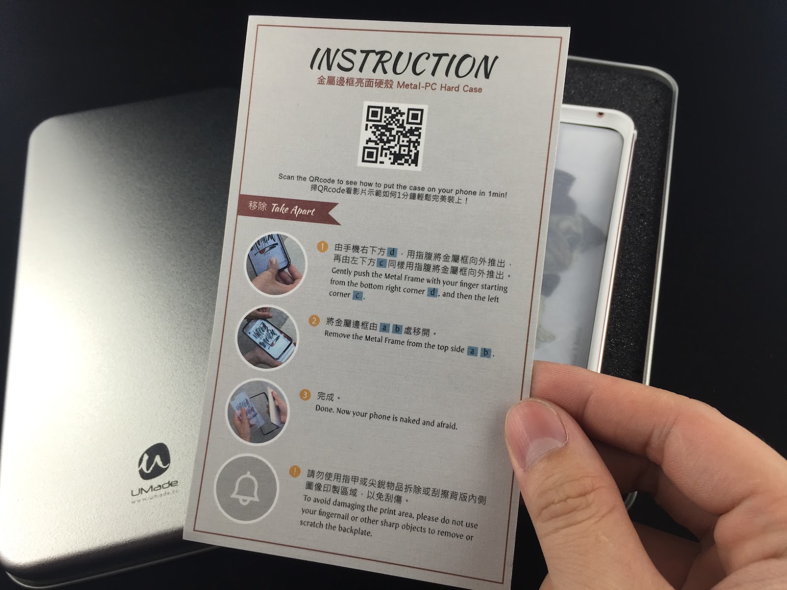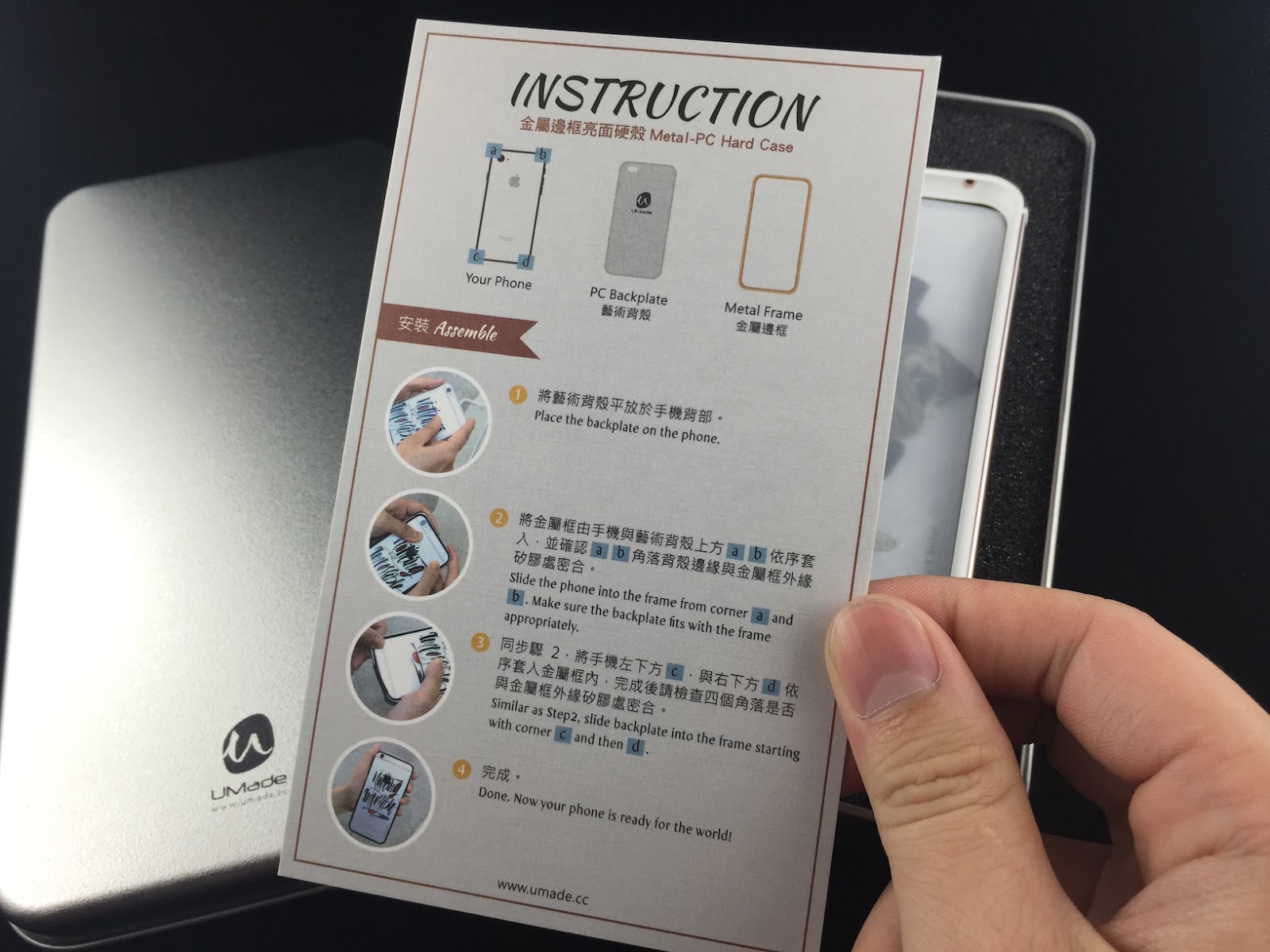 把背板放在 iPhone 上後,拿出 UMade 金屬邊框,準備合體。