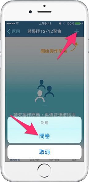 在確定了資料夾名稱之後,就可以按下右上方的 +,並且點擊問卷之後,開始製作問卷題目了。