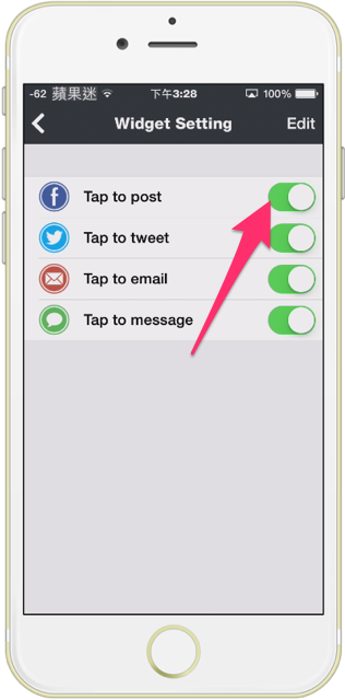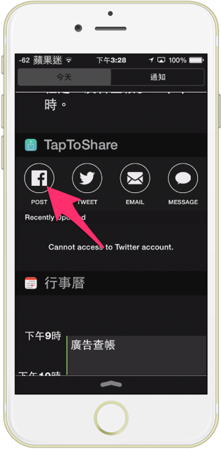 7.的確就可以在通知中心裡面看到 Tap To Share 囉,如果不知道如何在通知中心加入 Widget 的朋友,可以點擊這裡,觀看教學喔。