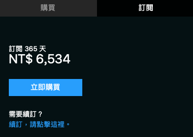 訂閱制 | 年繳:NT$8,064 月繳:NT$714 | 年繳:NT$12,096 月繳:NT$1,050 | 年繳:NT$6,534 月繳:NT650 |