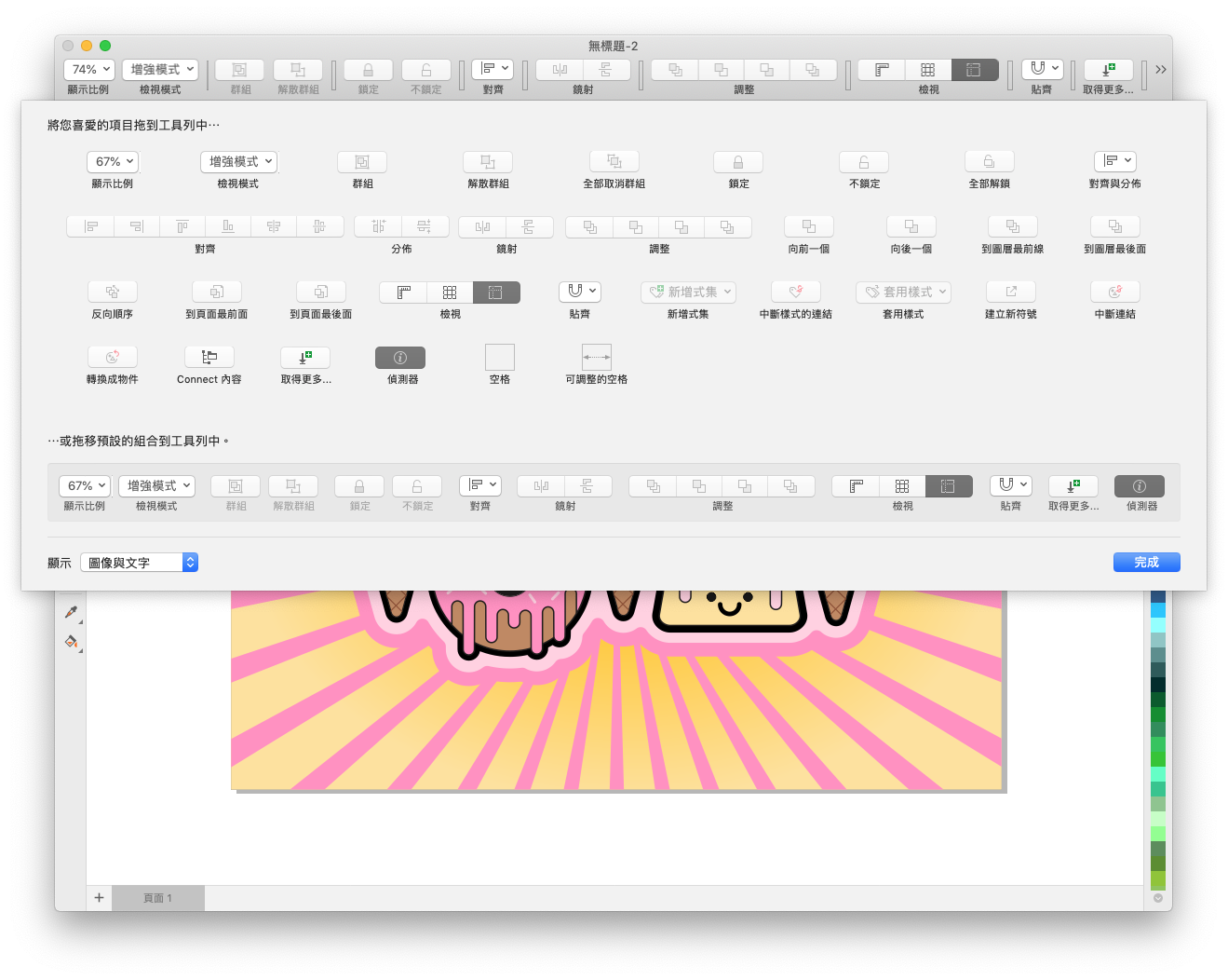 上方工作列的部分也可以自己設定,大致上就是有這些選項可以選擇,Mac 在這邊的好處就是上面可以直接加入「對齊」與「分佈」這兩個工具,這樣就不用一直卡右邊的選單了。