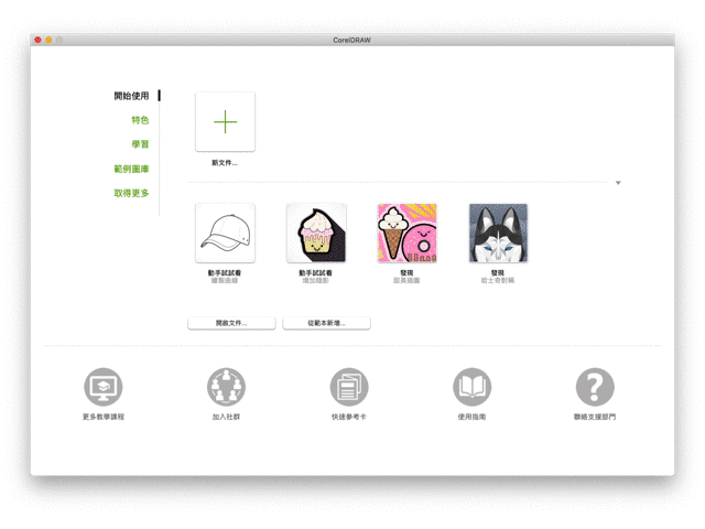 啟動畫面分成【開始使用】、【特色】、【學習】、【範例圖庫】、【取得更多】五種功能。