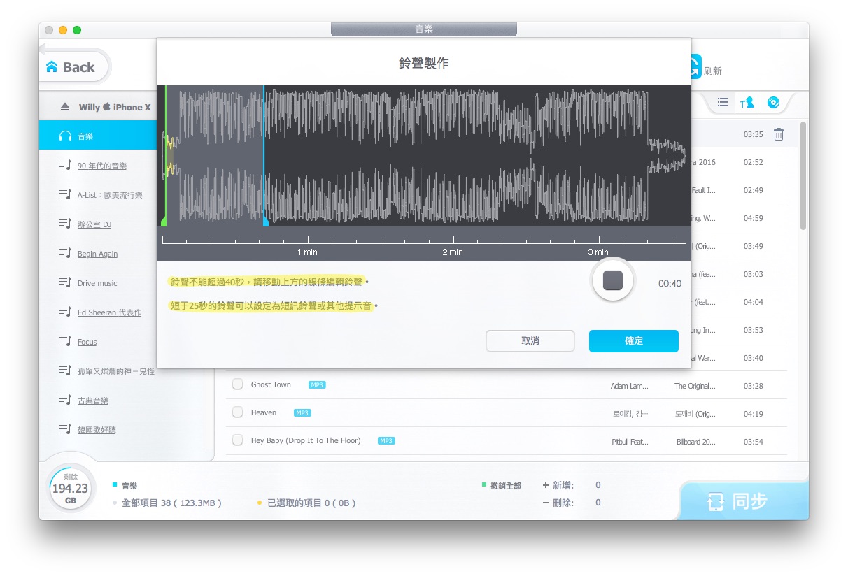 就可以直接左右移動,自己選擇想要的部分當做鈴聲,下方還有提示鈴聲長度不可超過 40 秒,如果要做短訊的話就要低於 25 秒。