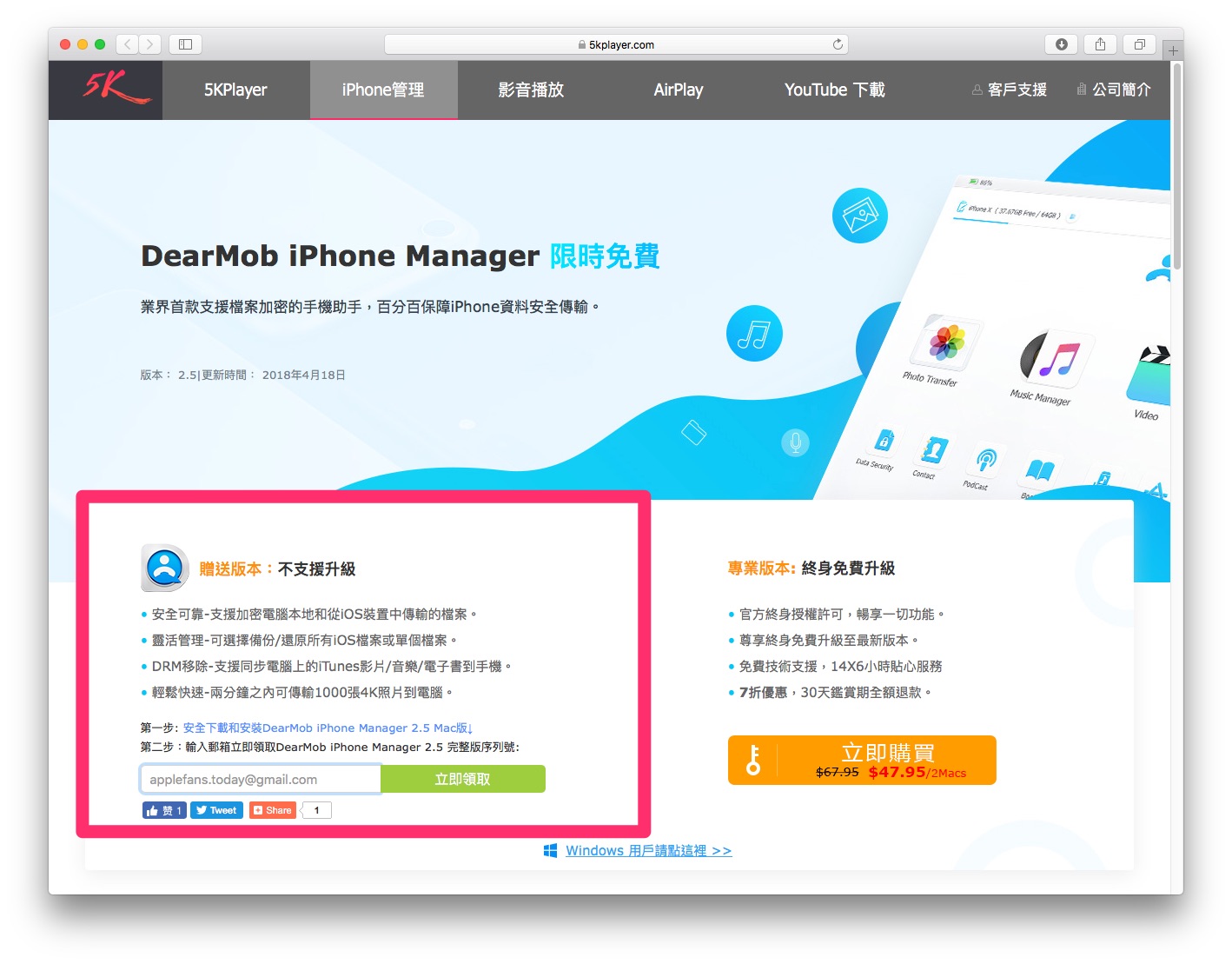 進入活動網頁後,請先下載 DearMob iPhone Manager,再填入你的 Email 並按下【立即領取】。