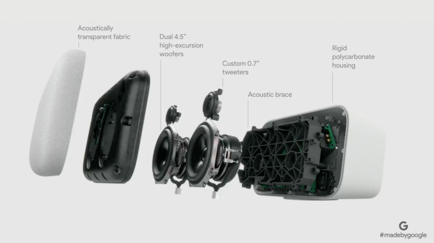 另一台 Google Home Max 則是一台更大型的音箱則是有更強大的音質與音效,能夠提供更良好的聲音讓用戶欣賞音樂。除了大聲外,Google 更開發了所謂的 「Smart Sound 」演算法,能夠在播音樂的同時計算房間的形狀,讓音樂在房間中有更好的填充效果。同時也優化了麥克風的接收能力,即使在播放大音量的音樂也能夠收聽到用戶的指令。