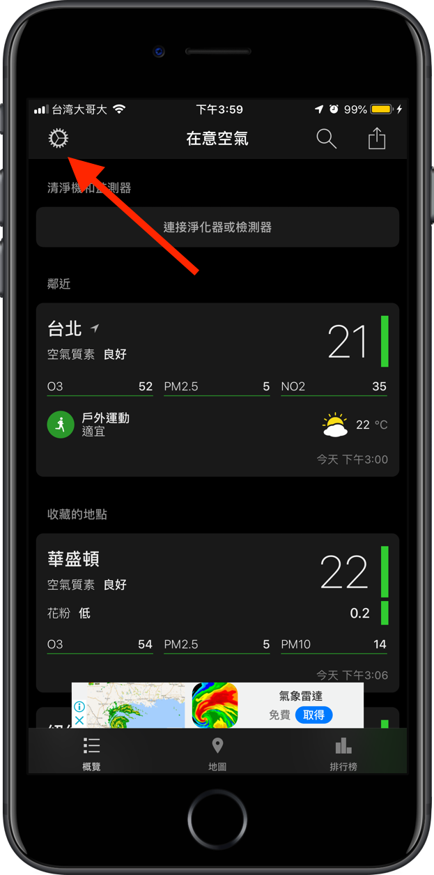 首先呢,先把 在意空氣 這款 App 下載下來,並在手機上開啟,接著點擊左上角的齒輪來進到詳細的設定項目當中。