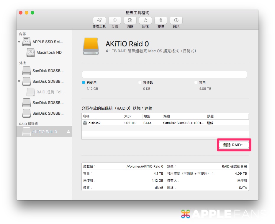 如果不想要 RAID 了,請在「磁碟工具程式」中選擇欲刪除的「RAID 磁碟組」,按一下「 刪除 RAID…」即可。
