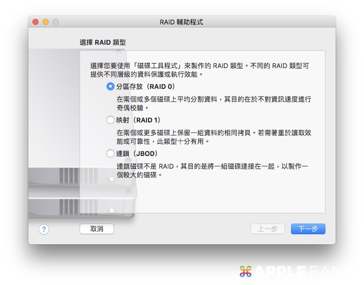 RAID 有分成不同的類型,每種類型也都有其優缺點,以下就以 Mac 可以製作的 RAID 來說明其功用:
