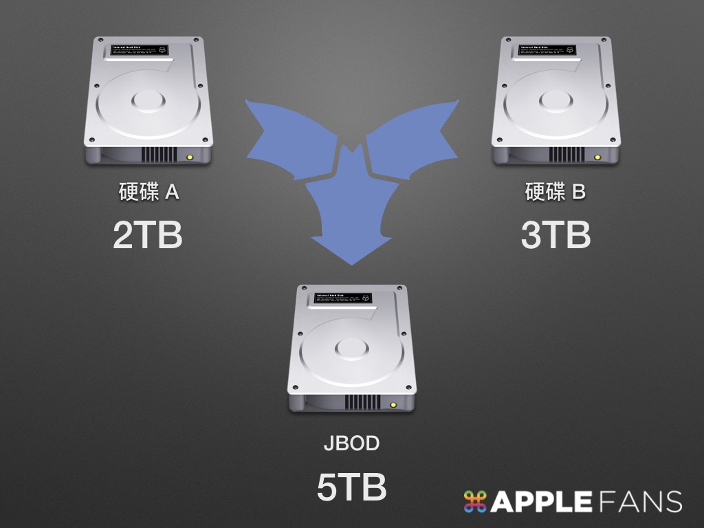 簡單來說,就是你用一顆 2TB 跟一顆 3TB 的硬碟組成 JBOD,就會直接變成 5TB 的硬碟,除了容量提升之外,速度完全沒變。