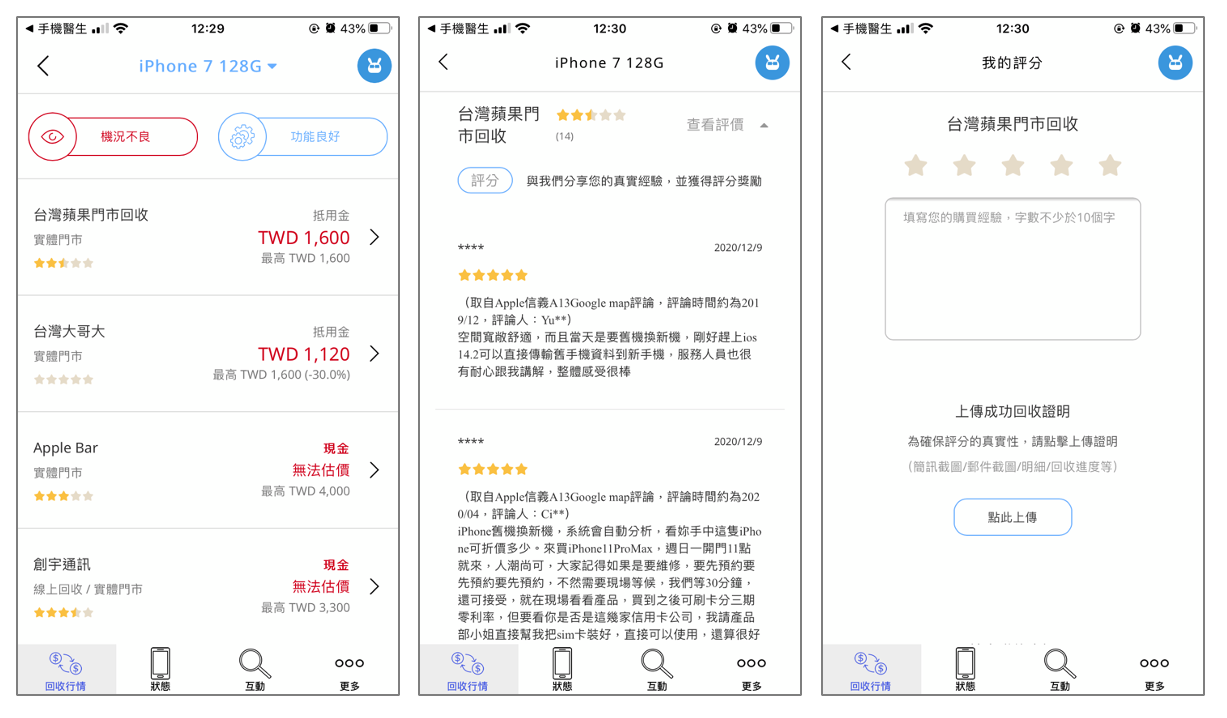 而且手機醫生現在還新增了評分功能,不只價格高低,還可以依據前人的經驗決定要到哪個通路回收,免得期待滿滿送出去回收,卻因為零星客服問題或被大幅度扣款而一肚子氣,當然,如果你曾經有回收經驗,也可以點選評分按鈕留下你的經驗,造福後人。