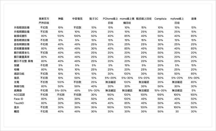 手機經過使用後,難免會有一些痕跡,若是比較粗心的人,可能還會有一些外觀或功能上的損壞,這邊也搜集了依據各個通路網站上的資料,整理出的大概扣款規則註1;以及在不同手機狀態下,在各種條件、情境下,適合的手機回收管道,來方便大家觀看。