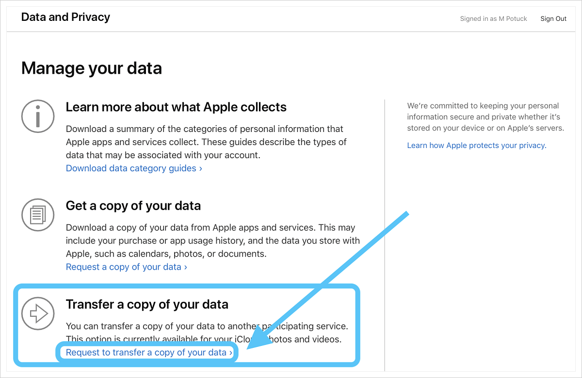 - 先從 Apple 的數據和隱私登入頁面(https://privacy.apple.com),選擇最下面的「Transfer a copy of your data」。