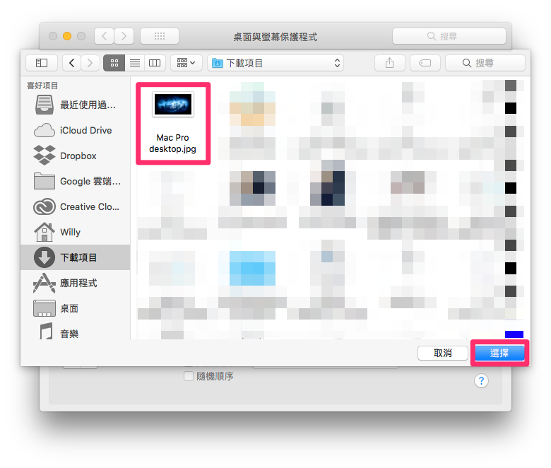 點選剛剛下載的 iMac Pro 桌布,並按下「選擇」。