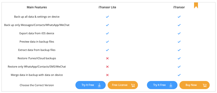iMyFone iTransor Lite 裡的 Restore Backup to Device(還原)功能,是需要專業版才可以做到,以下為各版本可以使用的功能: