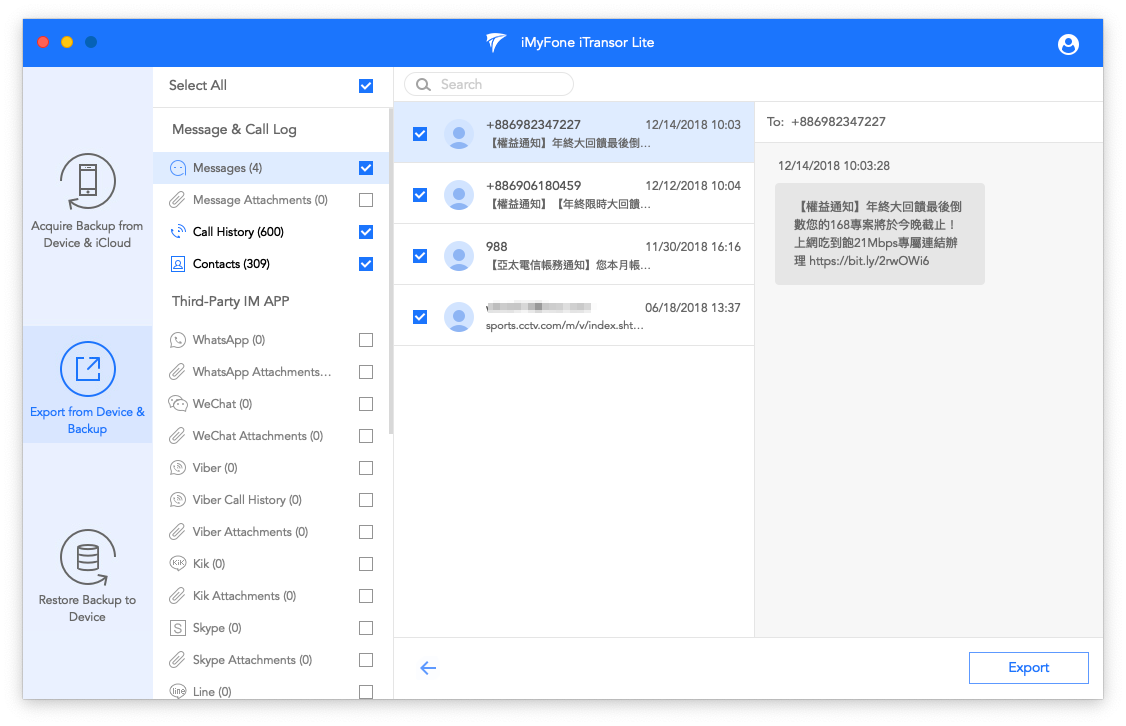 ⌘ 透過 iTransor Lite 使用輕鬆匯出想要的資料