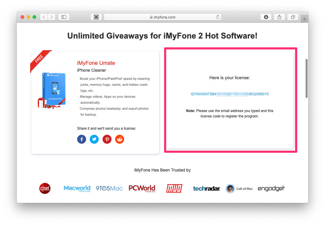 剛好現在正是 iMyFone 聖誕節限免活動中,只要在下方連結中的在 Facebook、Twitter 或是 Pinterest 分享,iMyFone 就會直接提供正版的序號哦~
