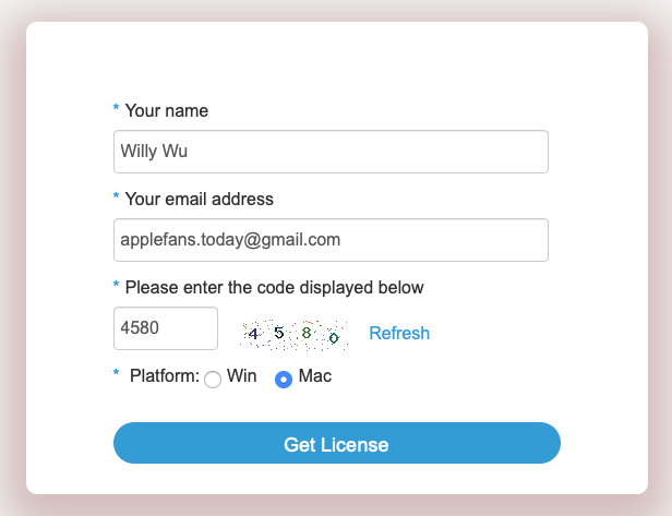 接著填入姓名、Email 即可收到正式版的序號摟!