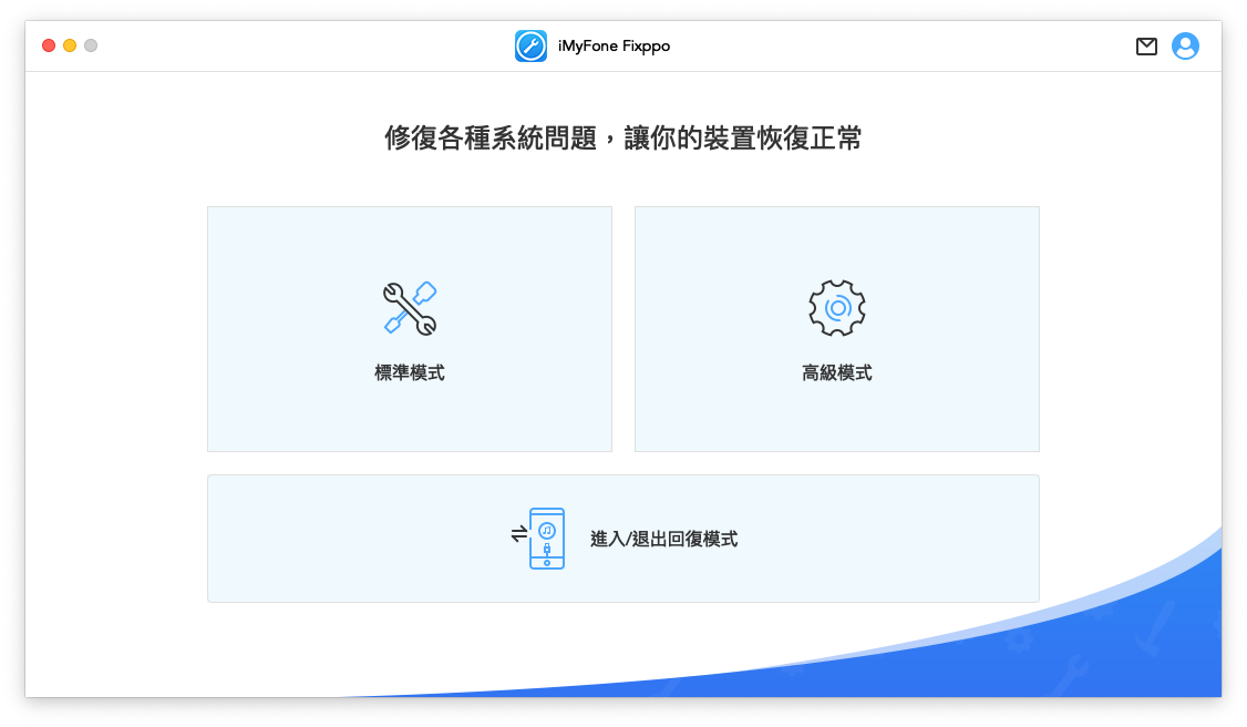 下載並開啟 iMyFone Fixppo,會在主畫面看到 3 種模式,分別是「標準模式」、「高級模式」以及「進入/退出回復模式」。