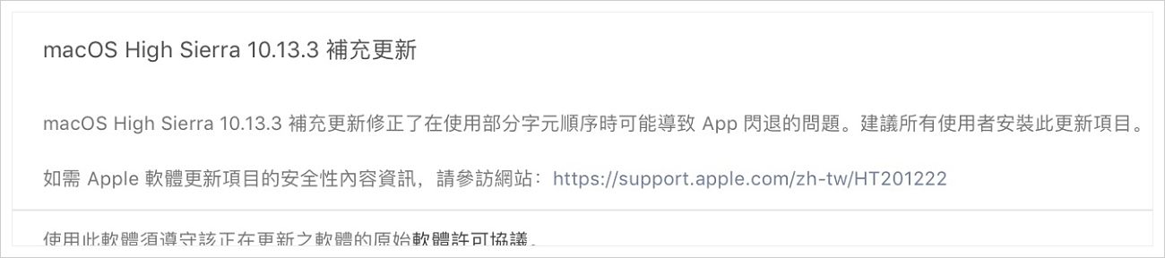 事實上不僅僅是 iOS ,macOS 上遇到同樣的問題,這類泰盧固語字符號也會引發 App 的閃退,所以除了 iOS 11.2.6 以外蘋果此次更新了 macOS 10.13.3 補充更新同樣也修復了此問題。