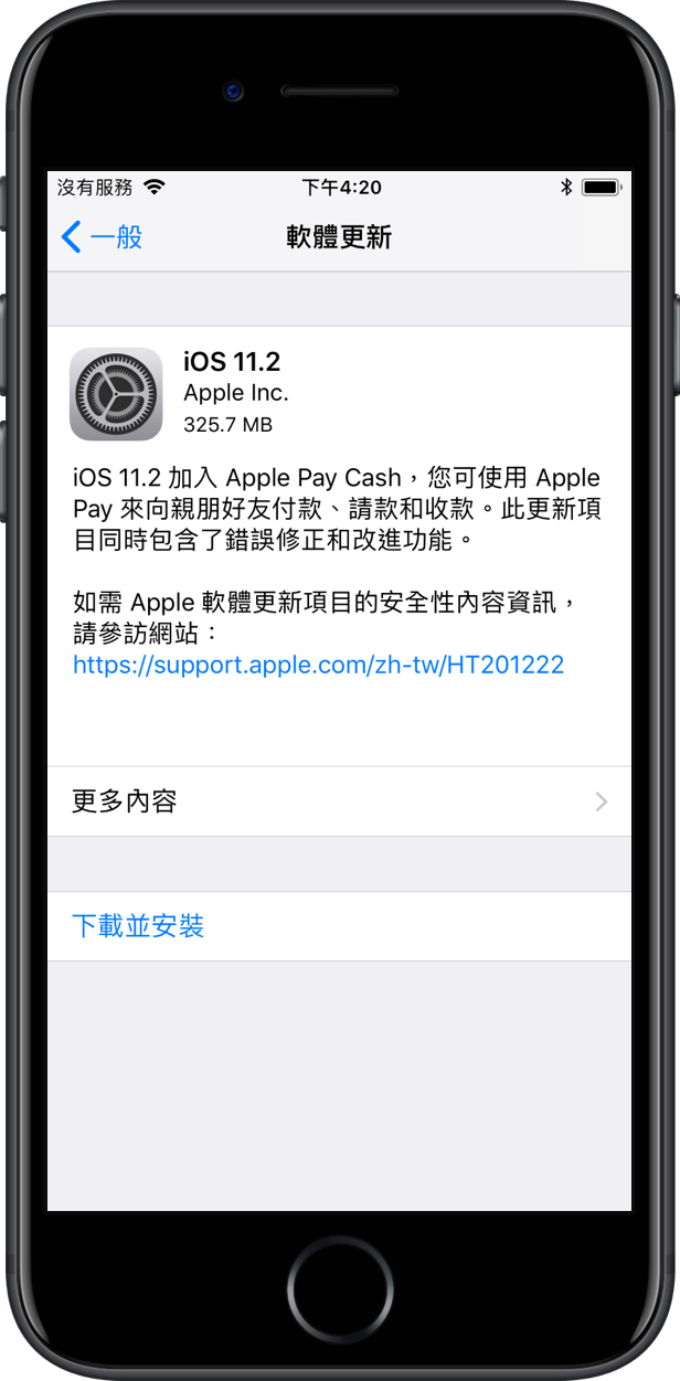 iOS 11.2 加入 Apple Pay Cash,您可使用 Apple Pay 來向親朋好友付款、請款和收款。此更新項目同時包含了錯誤修正和改進功能。