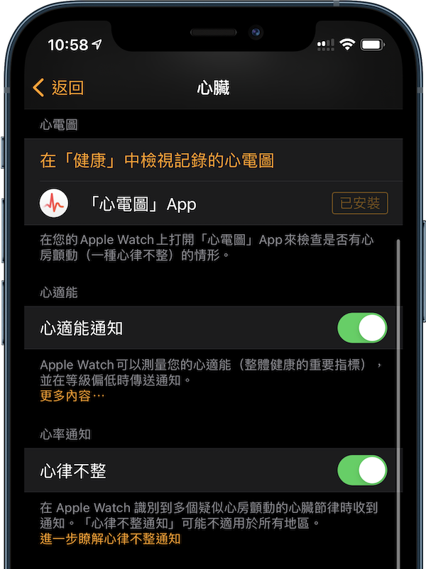 - 在日本、馬約特島、菲律賓、台灣和泰國的 Apple Watch Series 4 或後續機型上支援心律不整通知