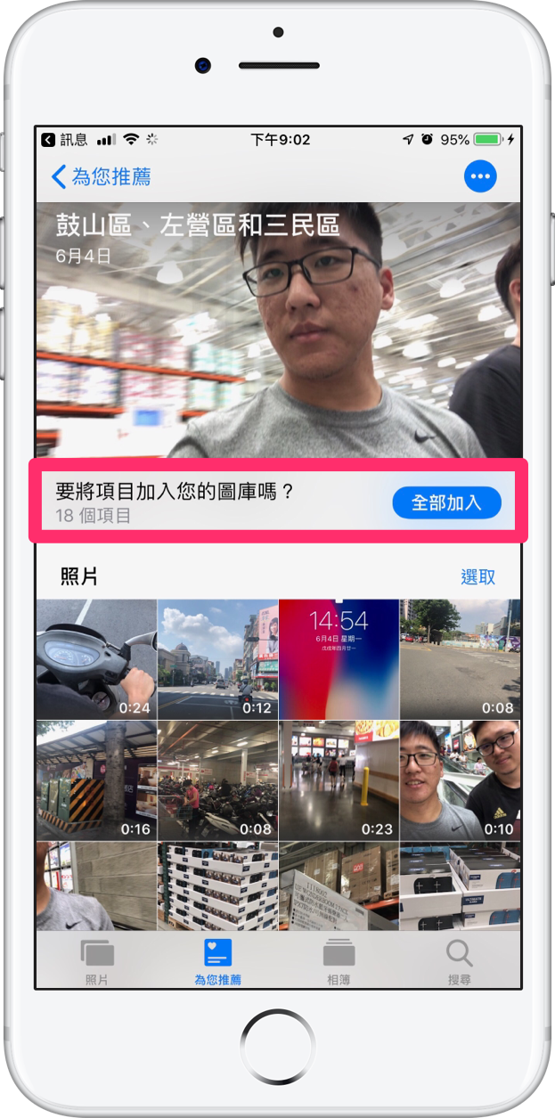在 iPhone 上就會自動出現在「為您推薦」標籤頁,還可以選擇【全部加入】來加到你的相簿中。