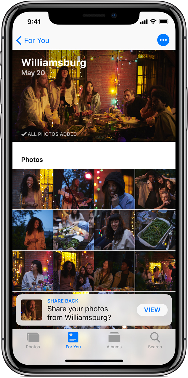 全新的分享建議功能可讓你更輕鬆地與朋友分享照片,並且會提示收到照片的朋友,分享他們在同一旅程或活動中所拍的任何照片和影片。