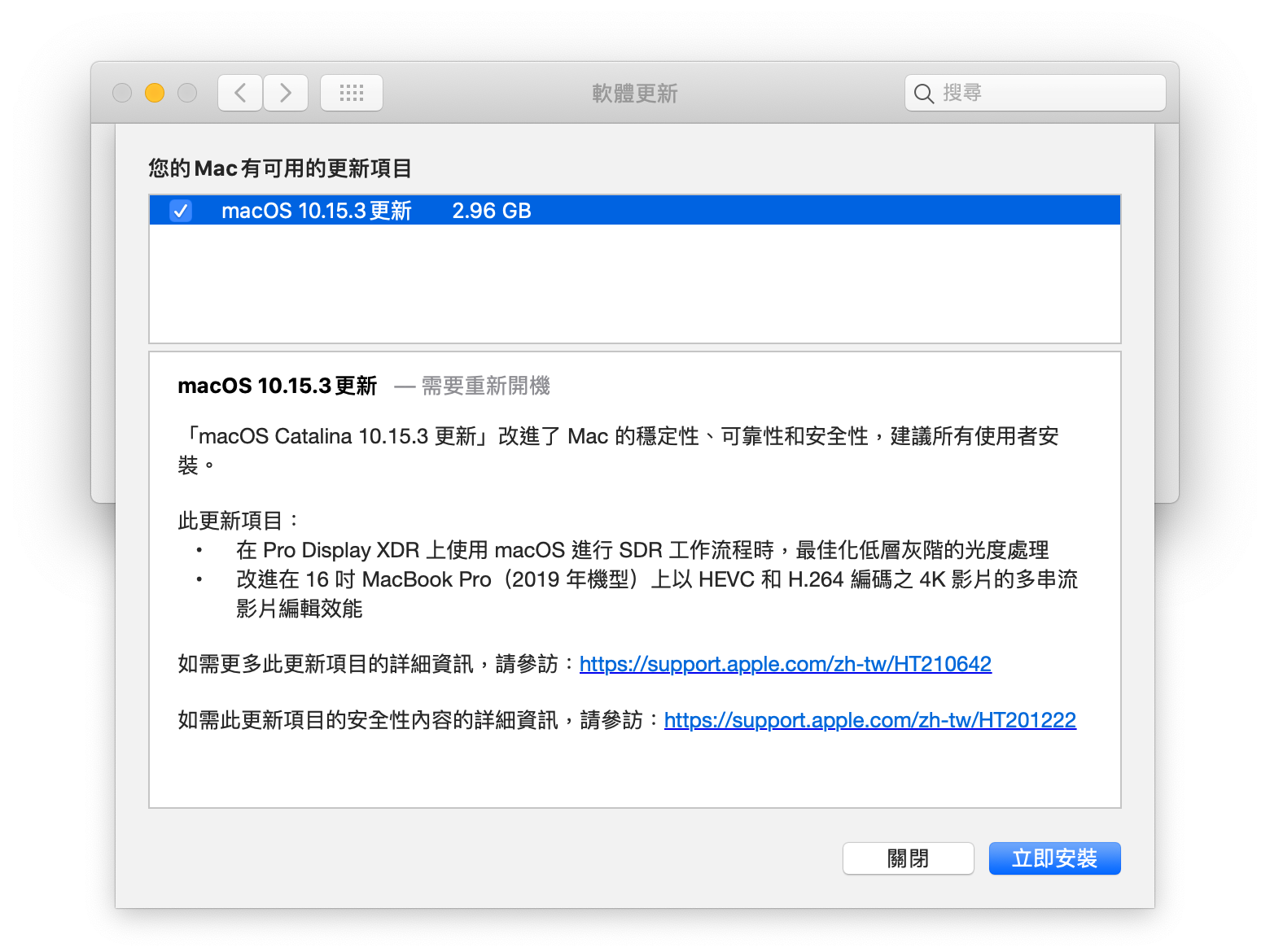 「 macOS Catalina 10.15.3 更新 」改進了 Mac 的穩定性、可靠性和安全性,建議所有使用者安裝。