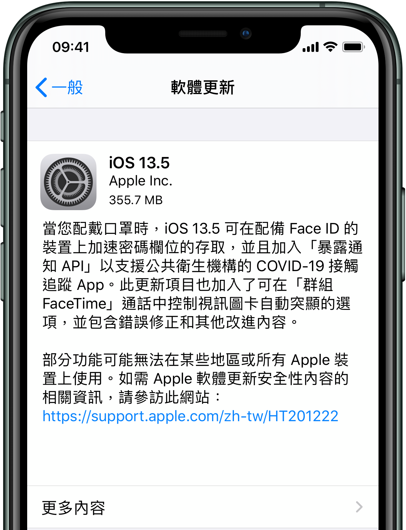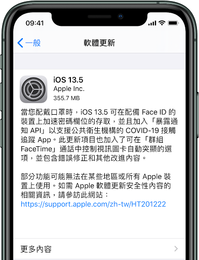 當您配戴口罩時,iOS 13.5 可在配備 Face ID 的裝置上加速密碼欄位的存取,並且加入「暴露通知 API」以支援公共衛生機構的 COVID-19 接觸追蹤 App。此更新項目也加入了可在「群組 FaceTime」通話中控制視訊圖卡自動突顯的選項,並包含錯誤修正和其他改進內容。