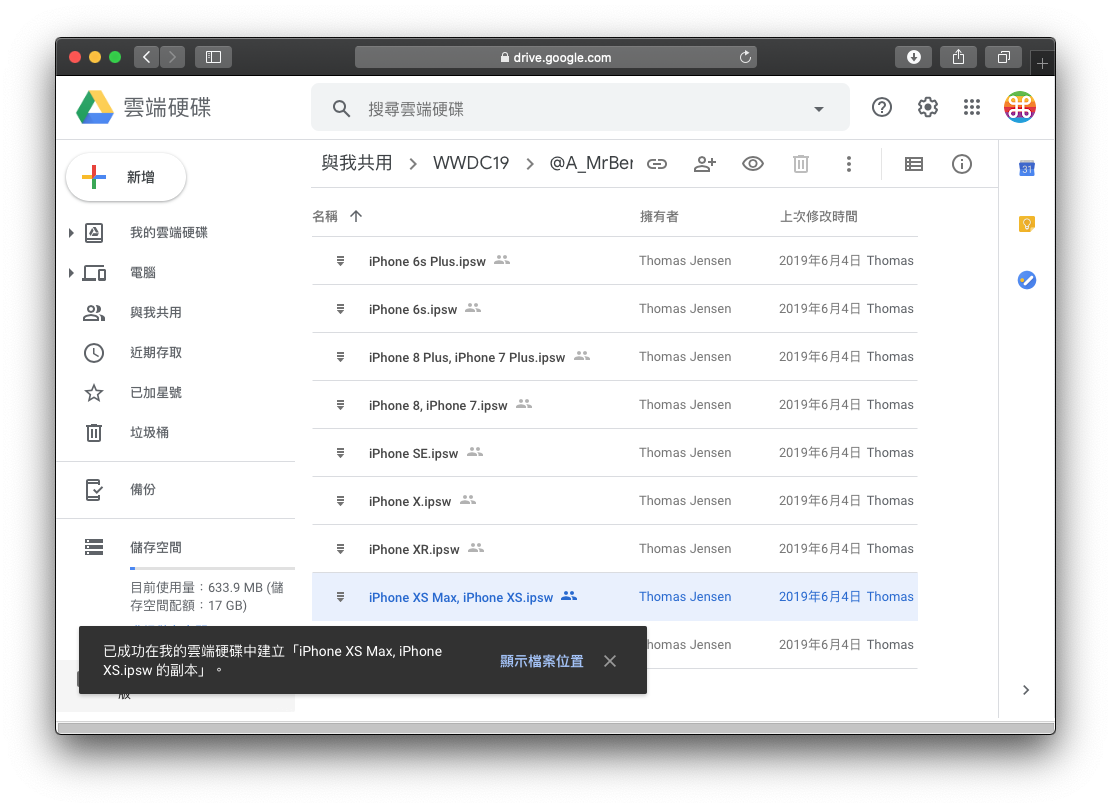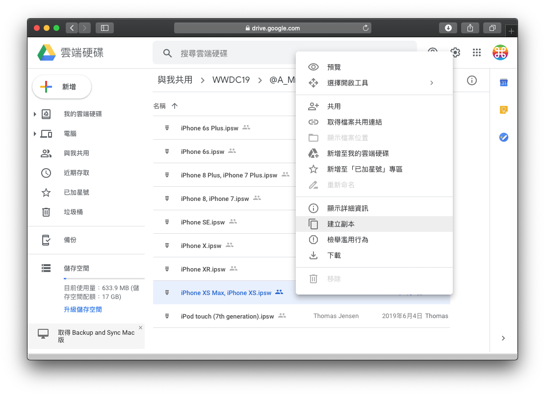 找到對應 iPhone 機型的 ipsw 檔,按下右鍵,選擇【建立副本】。