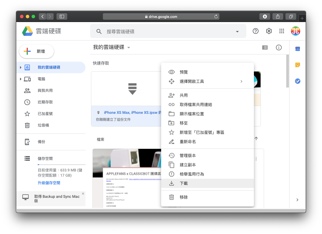 找到剛剛建立的副本,按右鍵並選擇【下載】,即可將檔案順利下載到你的電腦囉!