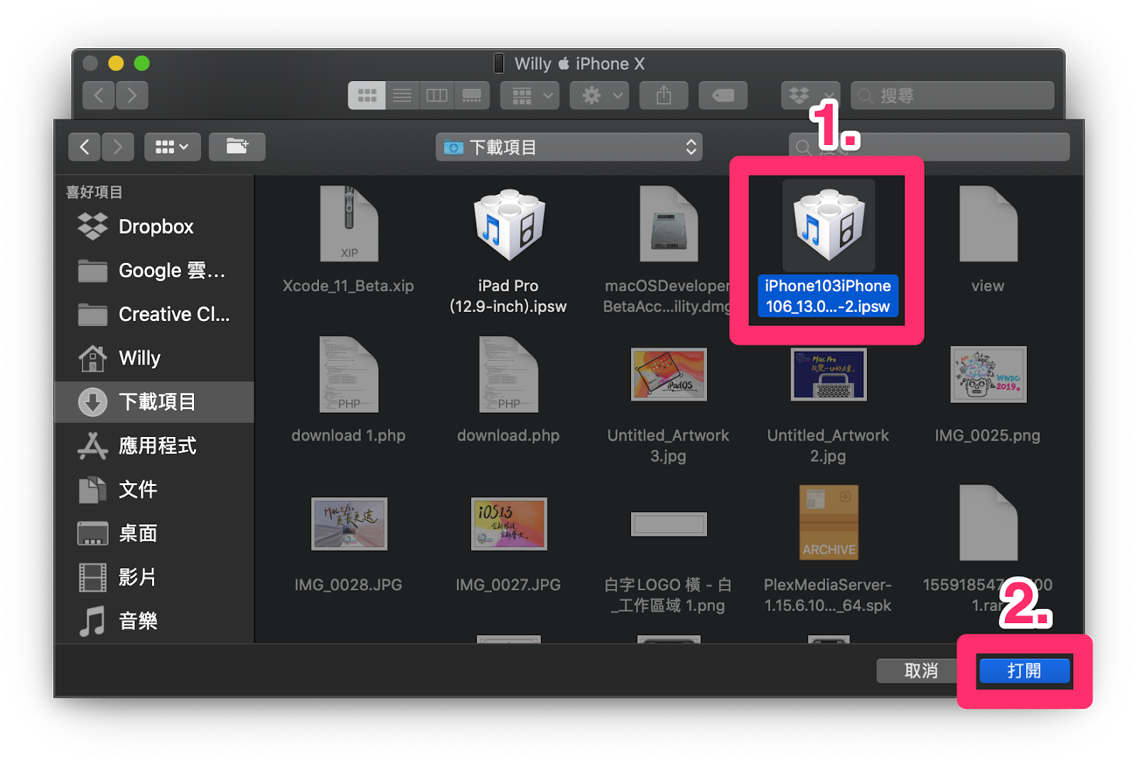 在跳出的視窗中找到下載好的【IPSW 檔案】,點一下檔案並【打開】。
