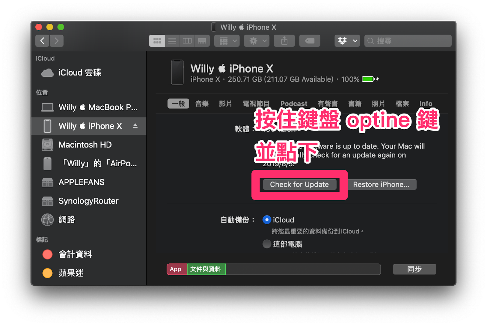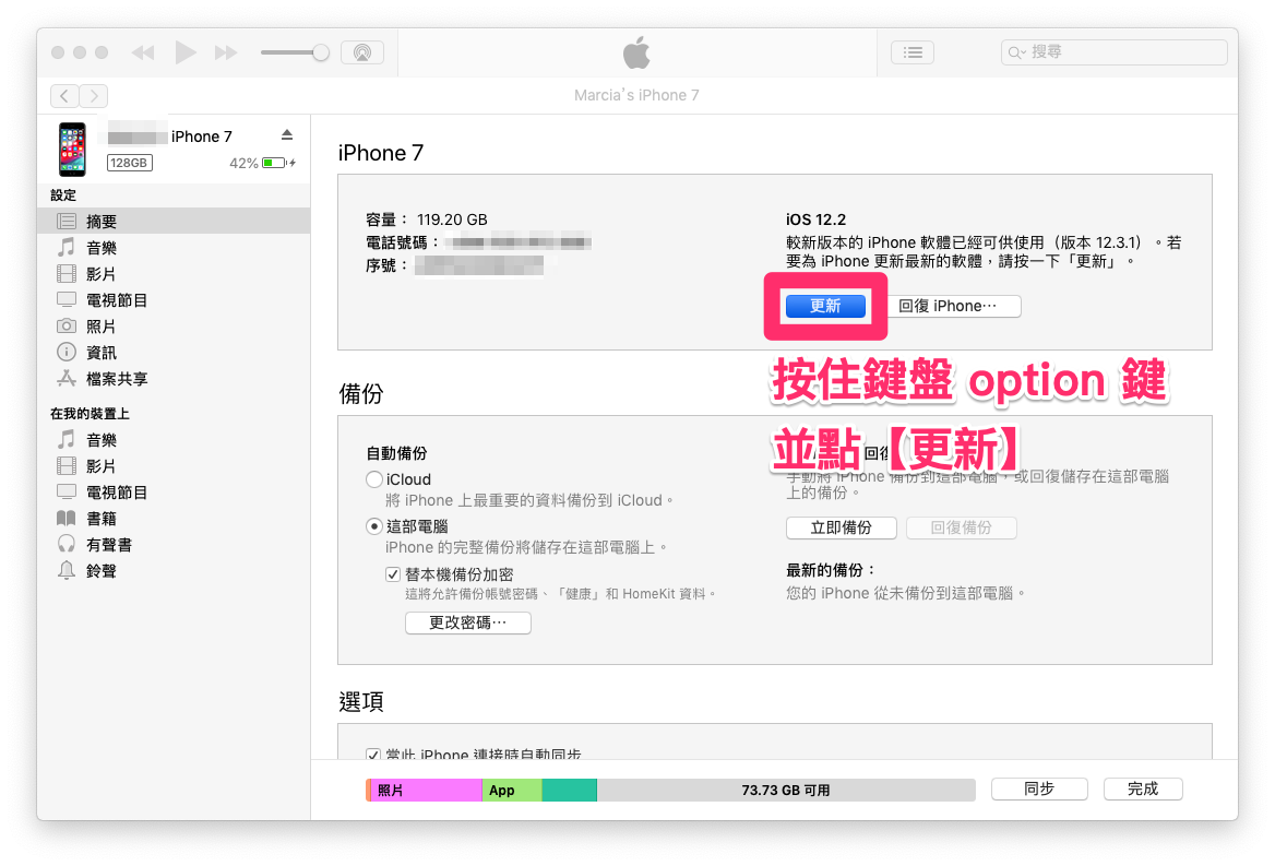 接著將欲升級的裝置連接至 Mac 並進入 iTunes 的裝置頁面,接著按住鍵盤上的【option】鍵,同時按下 iTunes 裝置頁面的【更新】按鈕。