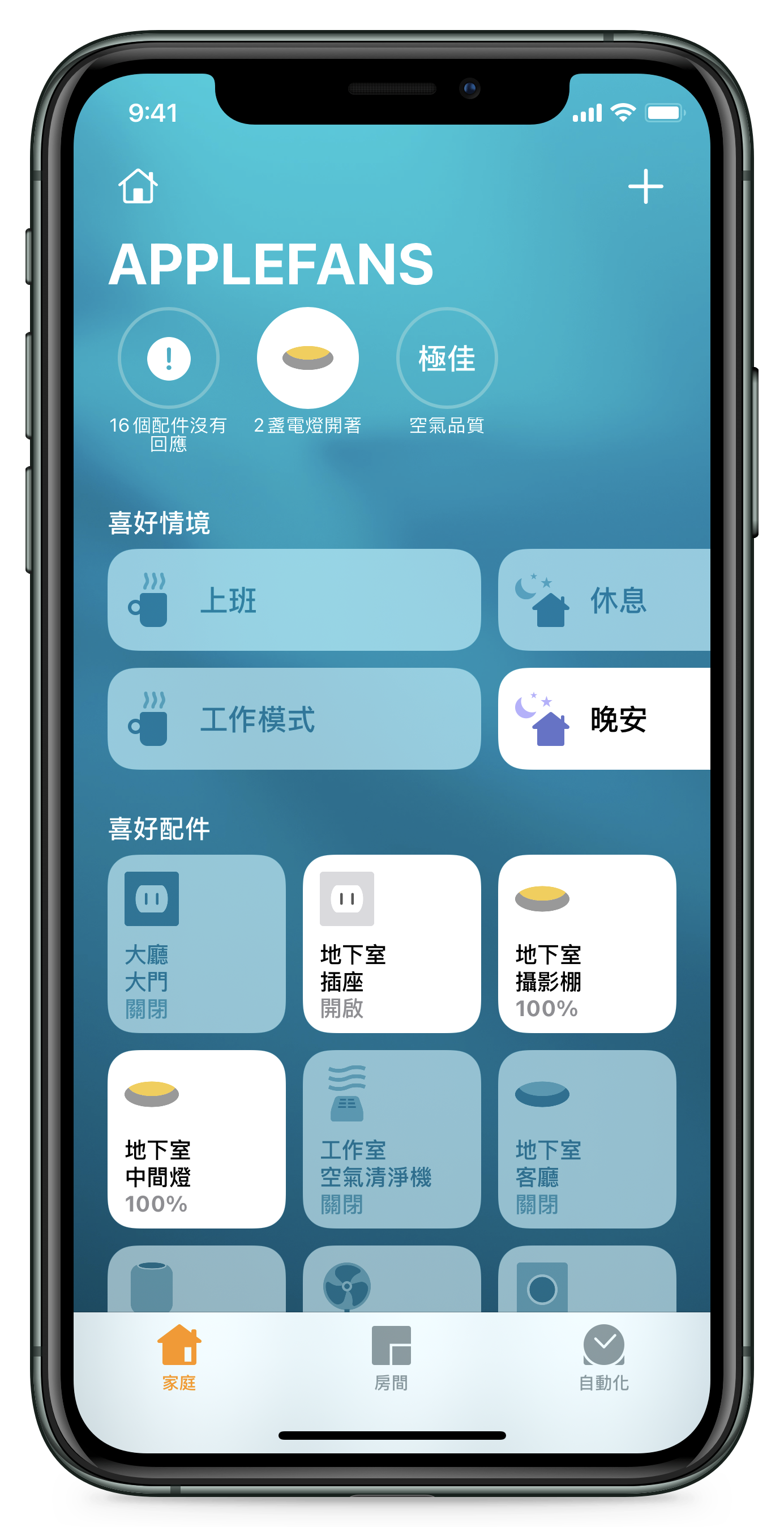 - 「家庭」App 上方的視覺狀態為您提供了需要注意的配件摘要