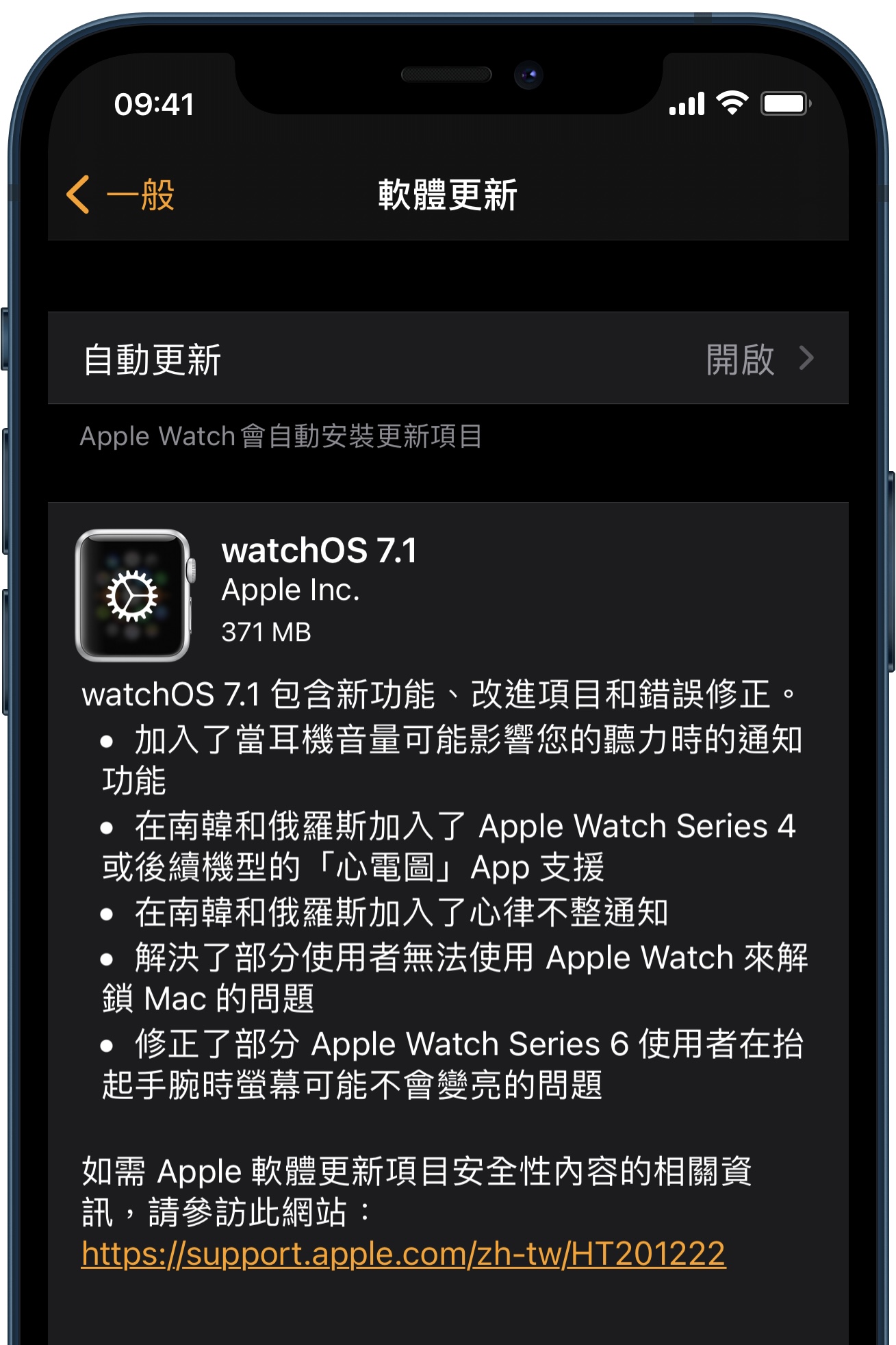 同一時間,watchOS 7.1 也推出了更新,主要加入耳機音量可能影響聽力的通知功能,另外也解決了 Apple Watch 無法解鎖 Mac 的問題。