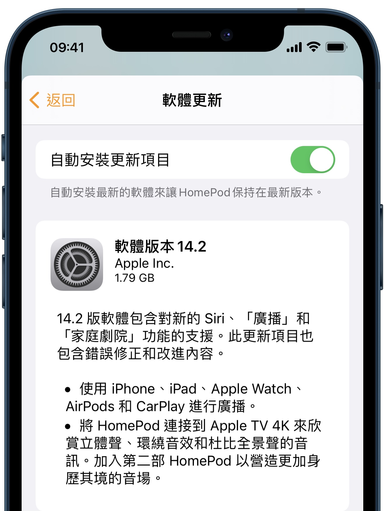 14.2 版軟體包含對新的 Siri、「廣播」和「家庭劇院」功能的支援。此更新項目也包含錯誤修正和改進內容。