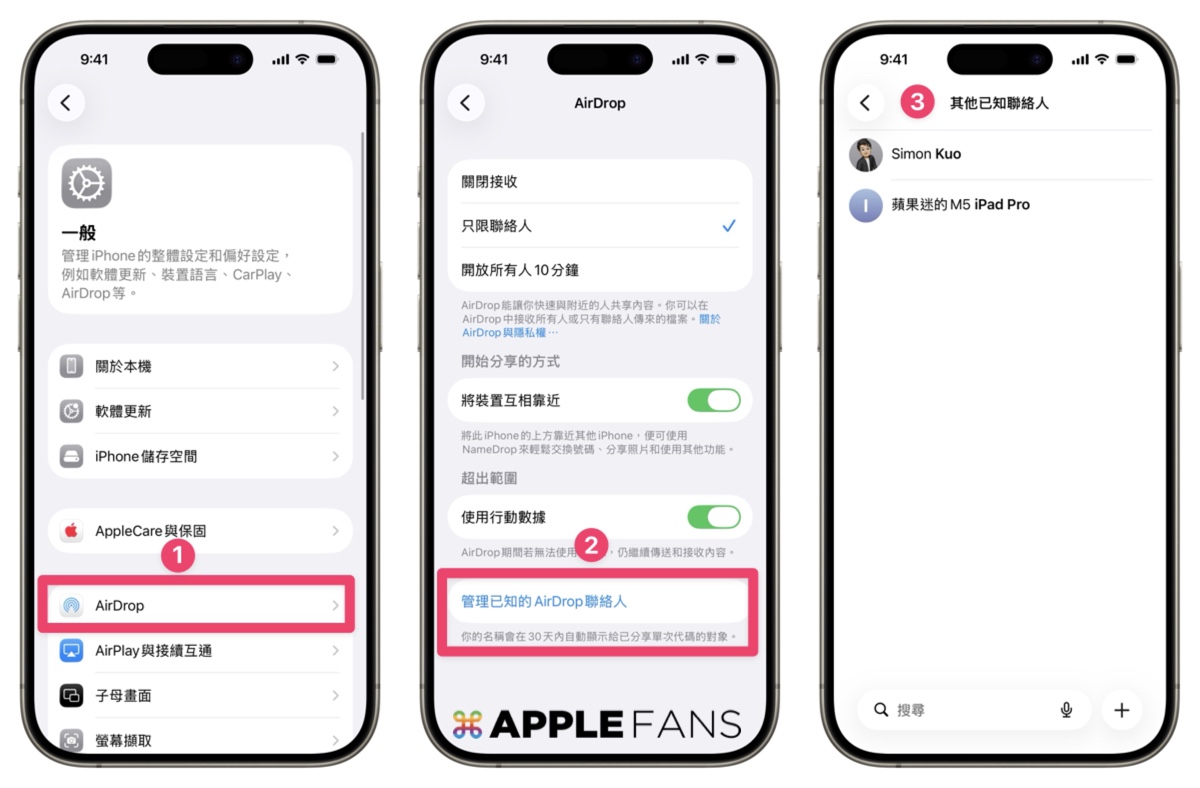 你也可以在「設定」 > 「一般」>「AirDrop」>「管理已知 AirDrop 聯絡人」中查看你曾分享過的一次性代碼對象。