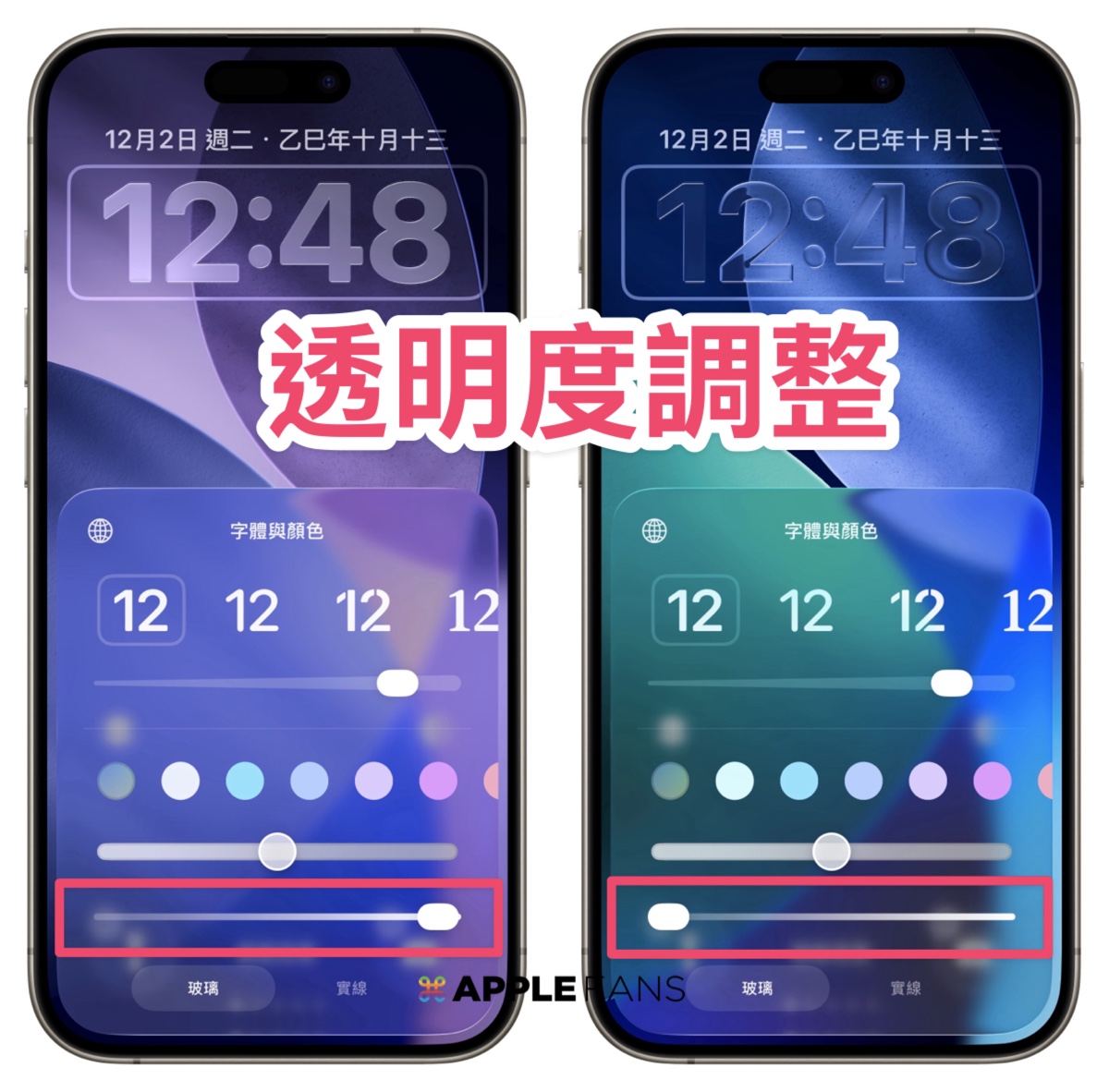 選擇「玻璃」選項之後,你可以透過滑桿把時間調成幾乎「透明」融進背景的感覺、或是更霧面的效果。