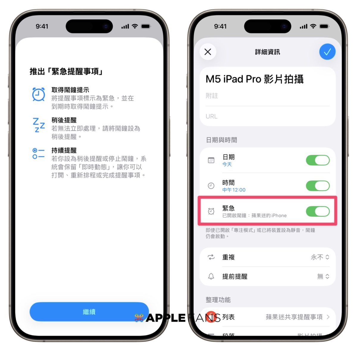 在新版的「提醒事項」裡,蘋果把鬧鐘功能加進去了!只要在建立提醒的時候,把「緊急」開關打開,並設定好指定時間,時間一到 iPhone 就會像鬧鐘一樣大聲提醒你。