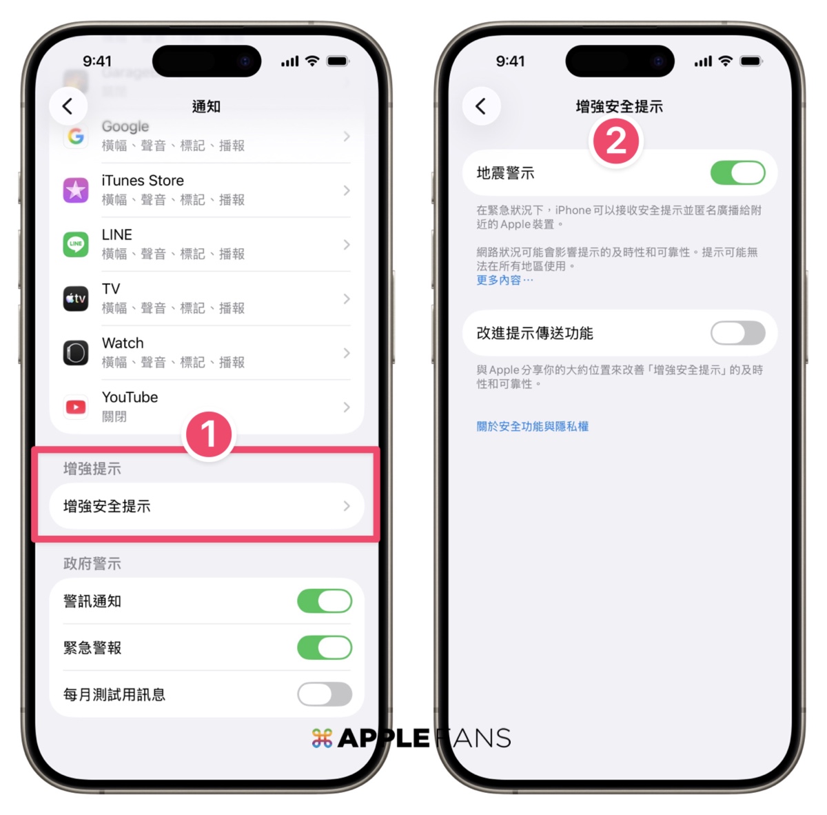 在「設定 > 通知」裡面,新增加一個「增強安全提示」,內容有地震警示、緊急威脅(視地區)、改進提示傳送功能。